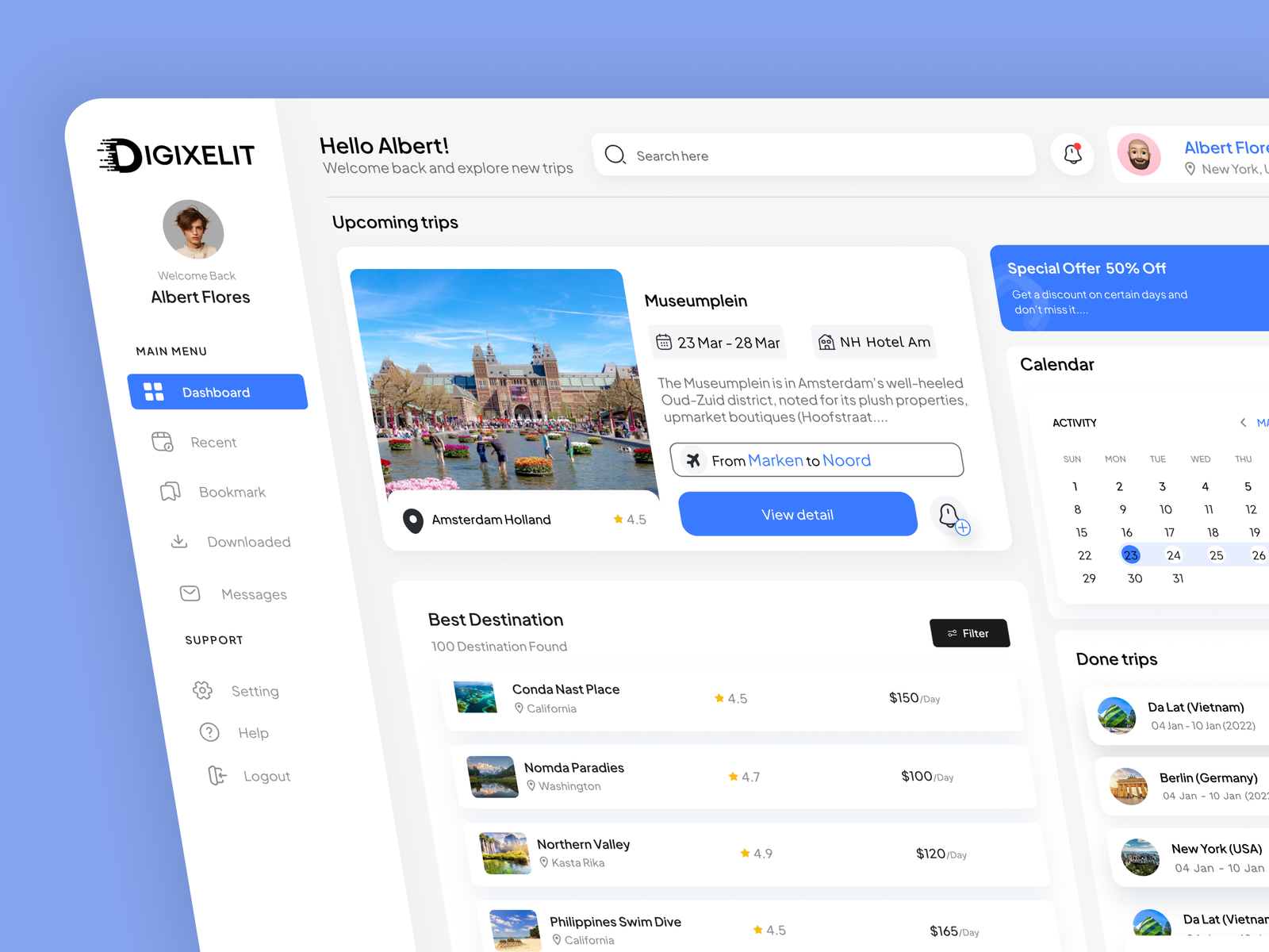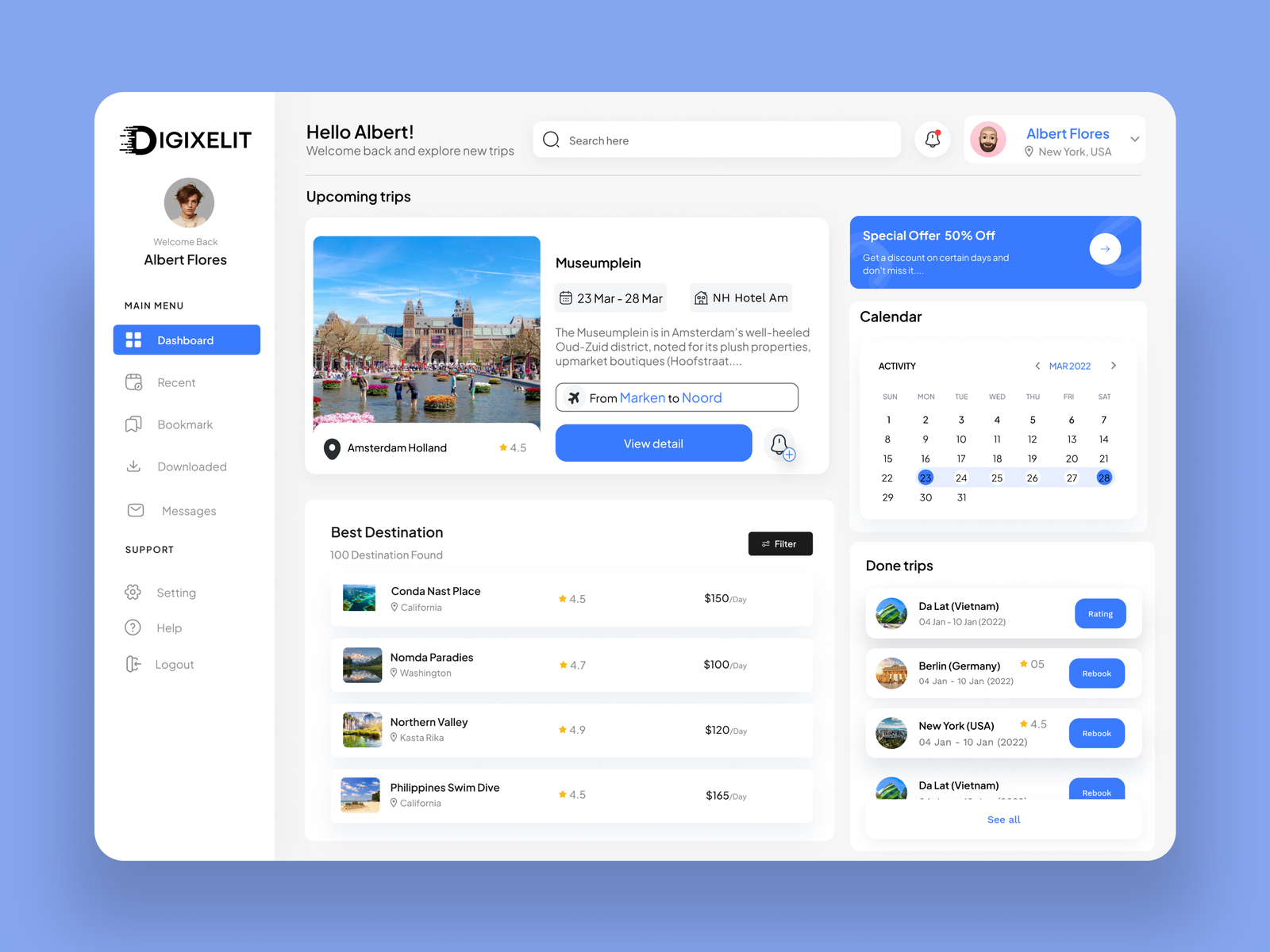 A visually engaging and modern Travel Dashboard UI template designed for managing travel data, bookings, destinations, and performance insights. Featuring a clean layout and intuitive data visualization, this dashboard is ideal for travel agencies, tourism platforms, booking systems, and travel-related SaaS applications. Available in Figma format, it allows easy customization to create stunning dashboards that enhance travel planning and user experience.