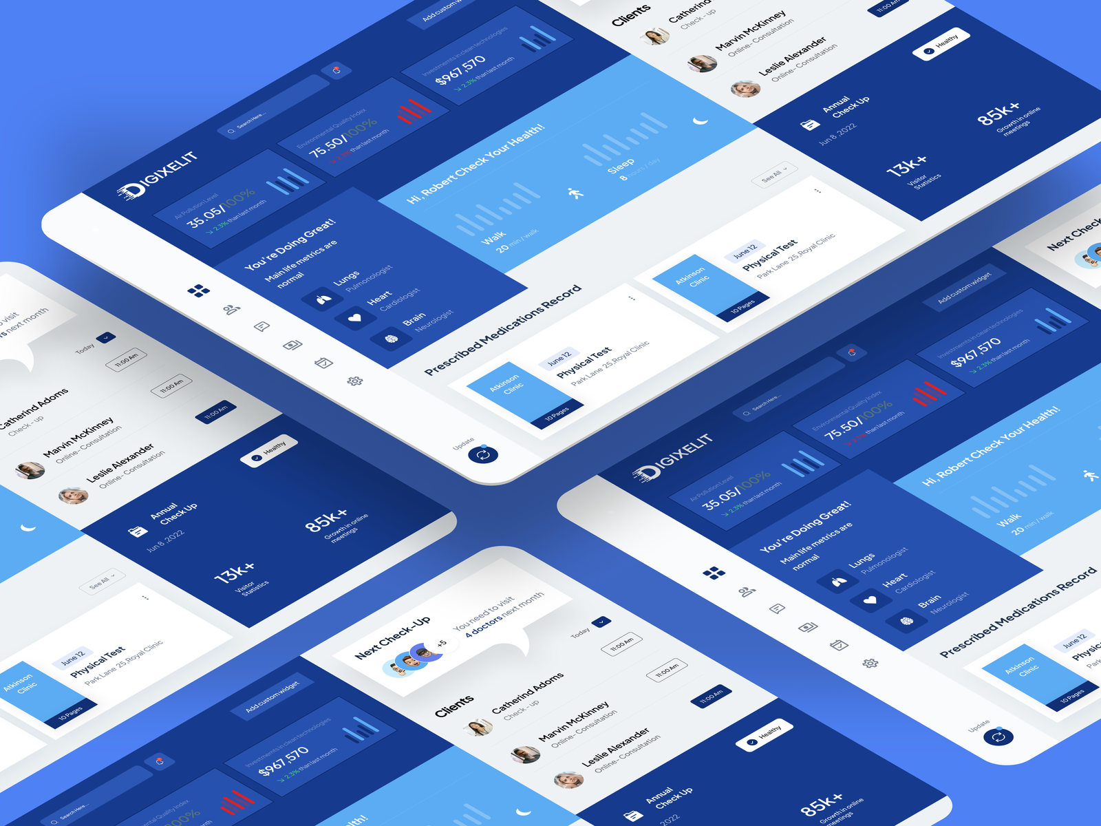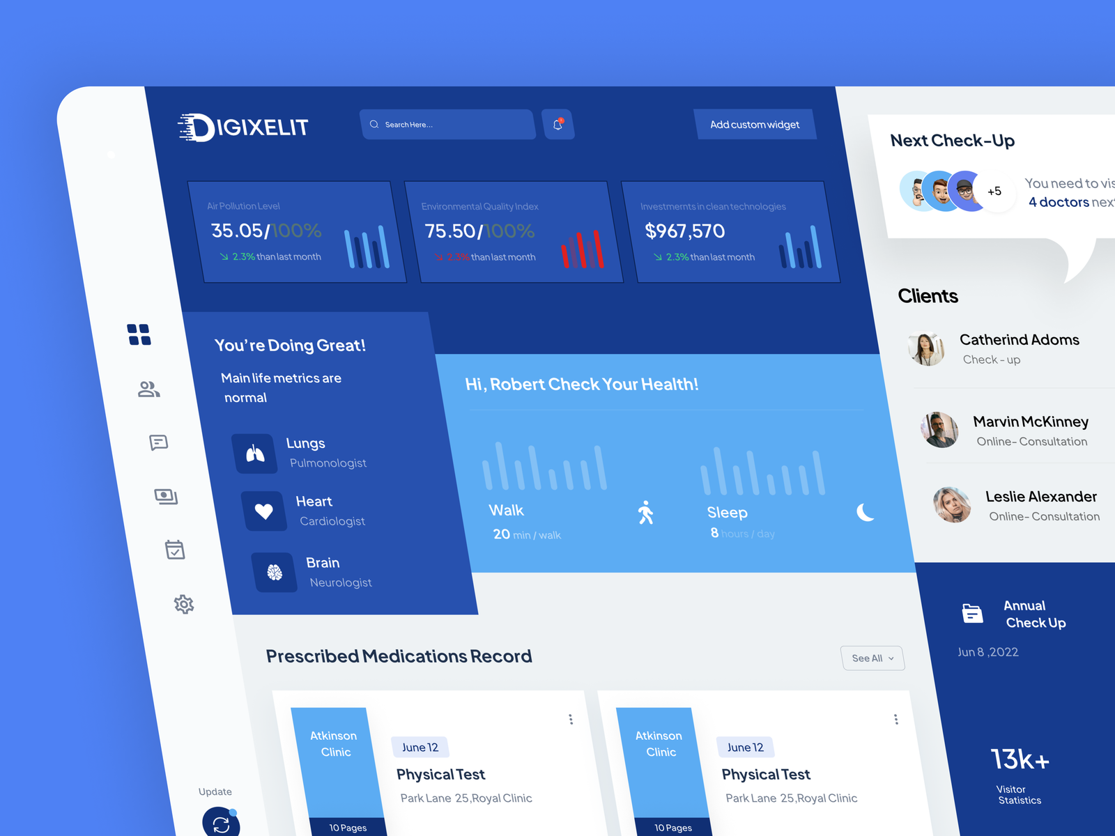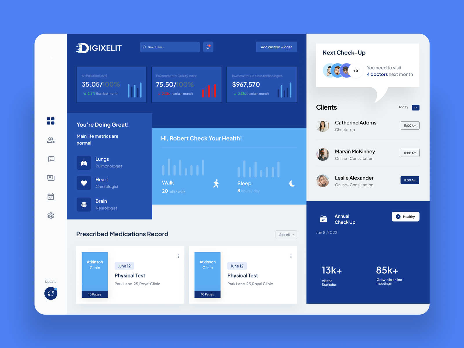 A modern and intuitive Medical Dashboard UI template designed for managing healthcare data, patient statistics, and medical analytics. With a clean layout and easy-to-read visual components, this dashboard is ideal for hospitals, clinics, healthcare systems, and medical management platforms. Available in Figma format, it allows designers and developers to quickly customize layouts and build efficient, data-driven medical dashboards.