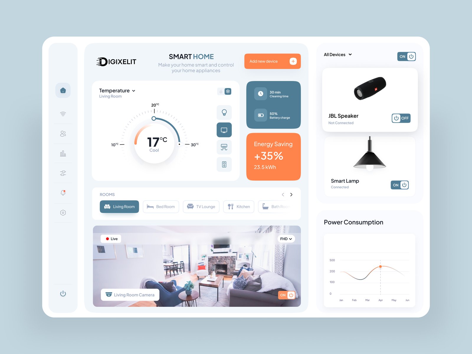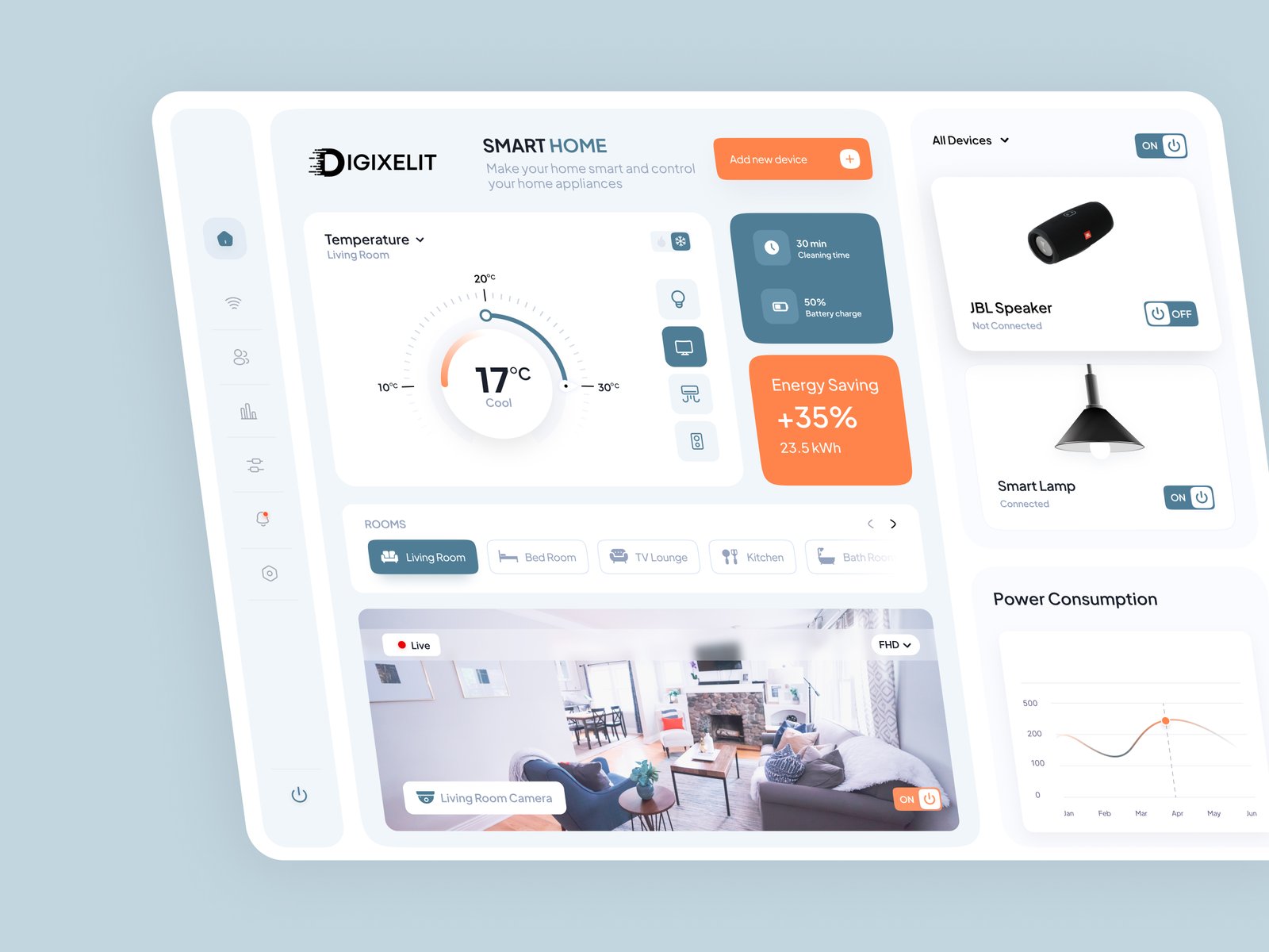 A modern and intuitive Smart Home Dashboard UI template designed to monitor and control connected devices, automation systems, and real-time home data. Featuring a clean layout, easy-to-read controls, and smart visual components, this dashboard is ideal for IoT platforms, smart home applications, home automation systems, and connected device interfaces. Available in Figma, XD, and Sketch formats, it enables designers to quickly customize layouts and build efficient smart home dashboards.